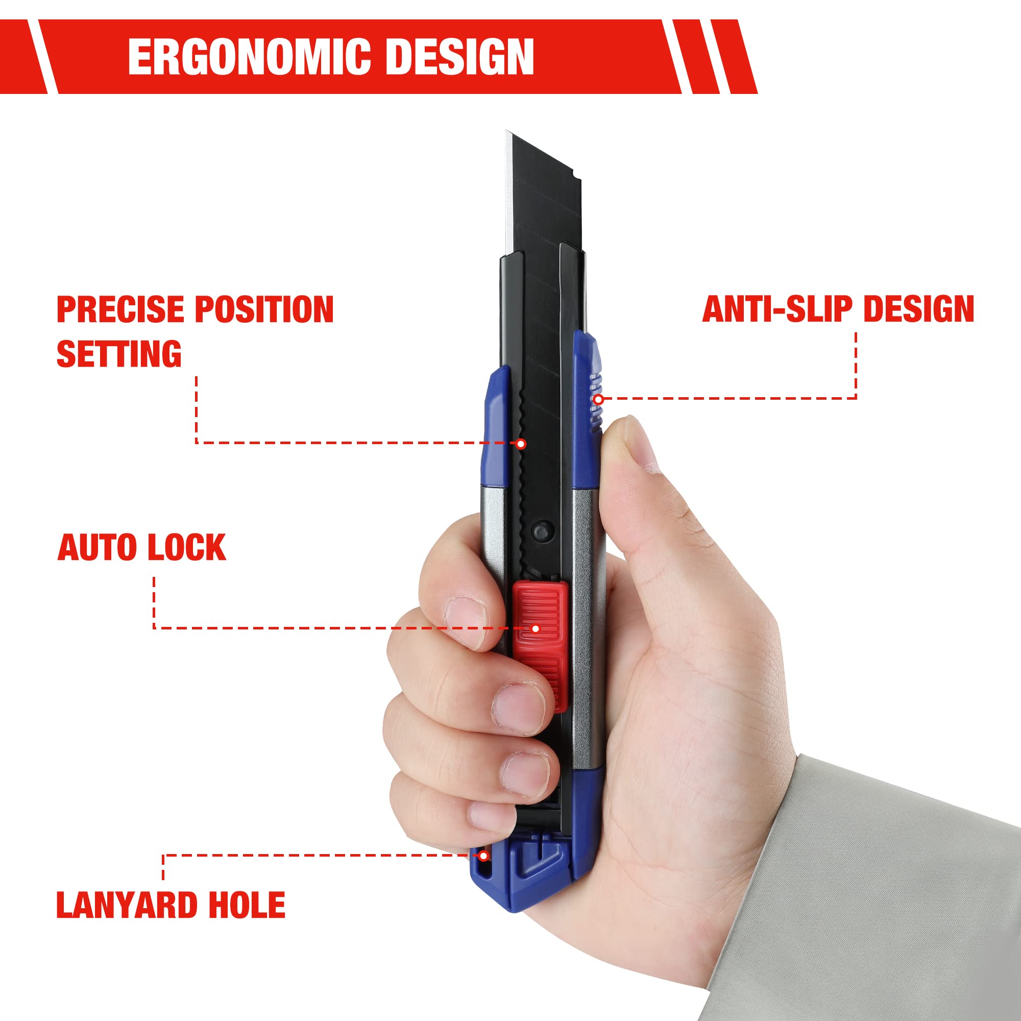 - Superior Cutting Performance: 18 mm wider utility knives are made from SK5 steel, which is greater in edge retention, thickness, sharpness, and durability; It is good for deep and easy cuts on paper, photos, plastic, cardboard, fabric, foam board, and more