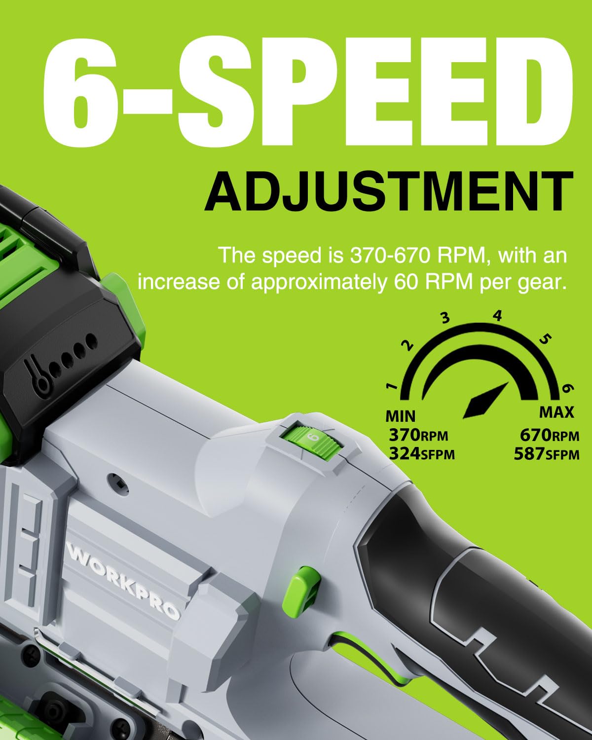 - 6 Adjustable Speeds: With six speed settings ranging from 370 to 670 RPM (324 to 587 SFPM), you can adjust the cutting speed based on the material and task at hand. Whether you're cutting metal, wood, or PVC, this saw handles it with ease