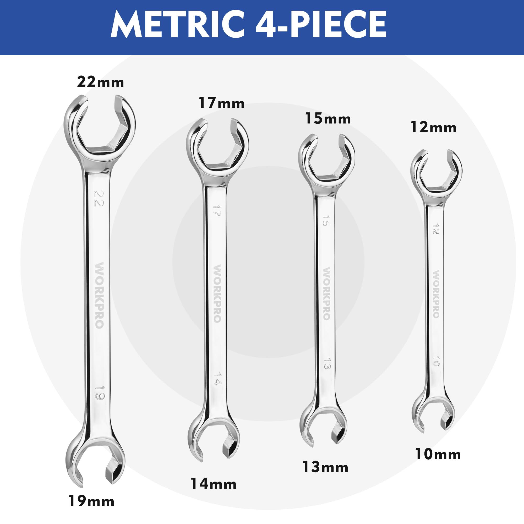 - HIGH QUALITY MATERIAL: WORKPRO flare nut wrench is made of heat-treated chrome vanadium steel, these wrenches are designed for longevity and durability; Mirror chrome finish provides resistance to rust, abrasion, and corrosion, increases service life