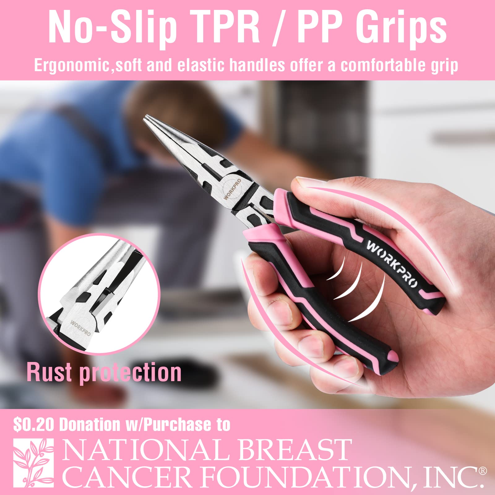 WORKPRO 4-Piece Pliers Set, Premium CR-V Construction Pliers Tool Sets Including Long Nose, Diagonal Cutting, Groove Joint and Slip Joint Pliers - Pink Ribbon