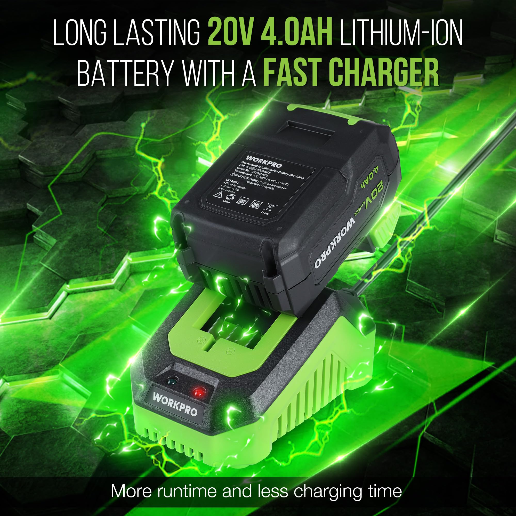 - Cordless Angle Grinder Kit: WORKPRO meets the needs of both serious DIYers and budget-minded Pros: This cordless angle grinder kit includes 1 × Cordless Angle Grinder, 1 × Fast Charger, 1 × 20 V 4.0 Ah Li-Ion Battery, 5 × 60 Grit Flap Discs, 5 × Metal/Stainless Cutting Wheel, 1 × Metal Safety Wheel Guard, 1 × Plastic Safety Wheel Guard, 1 × Spanner Wrench, 1 × Auxiliary Rubber Handle