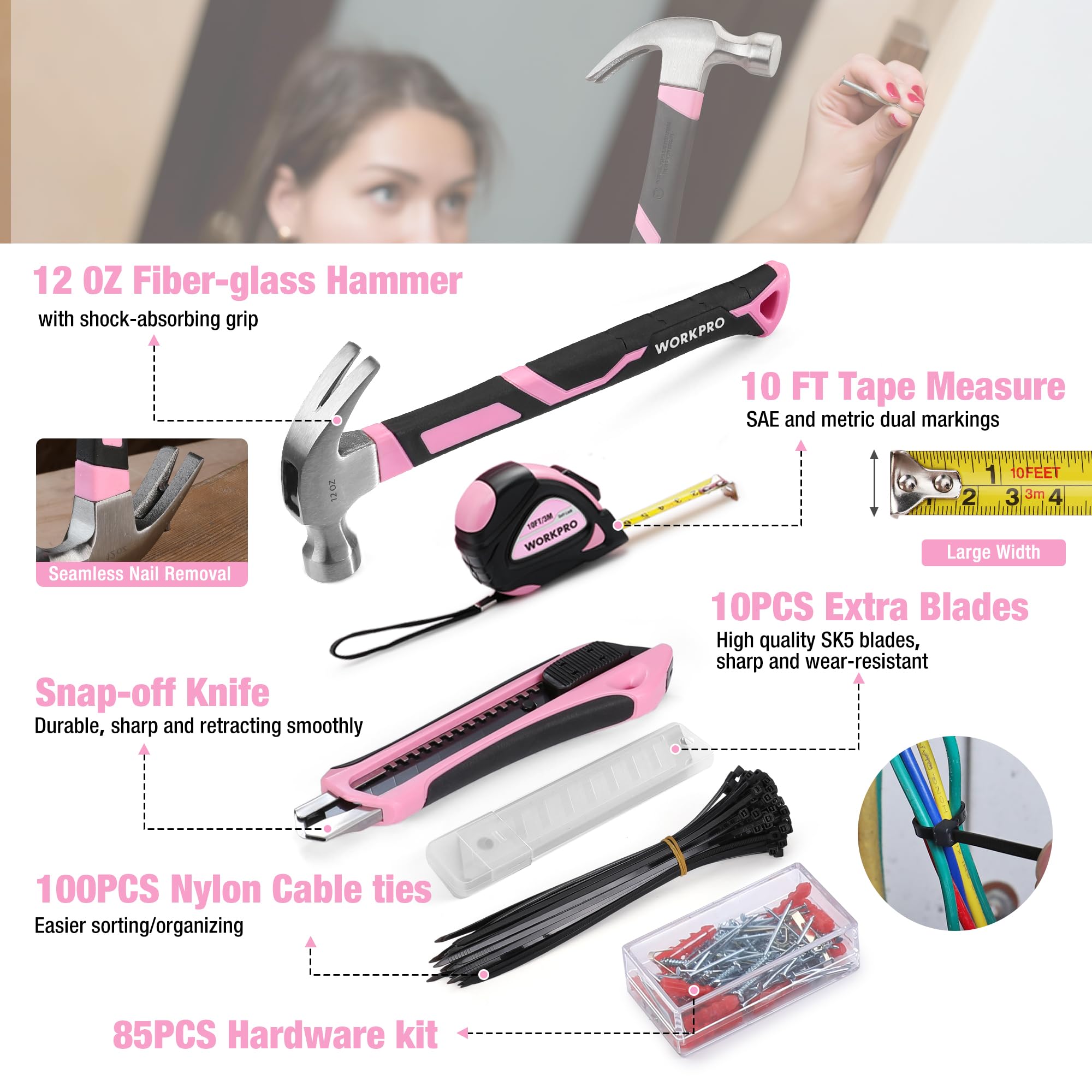 WORKPRO Pink Tool Set, 284 PCS Tool Kit for Women, Basic Household Pink Tool Box with Sockets, Pliers, Ratchet Handle, Portable Toolkit for Home Repair, New Apartment, House-Warming, DIY - Pink Ribbon