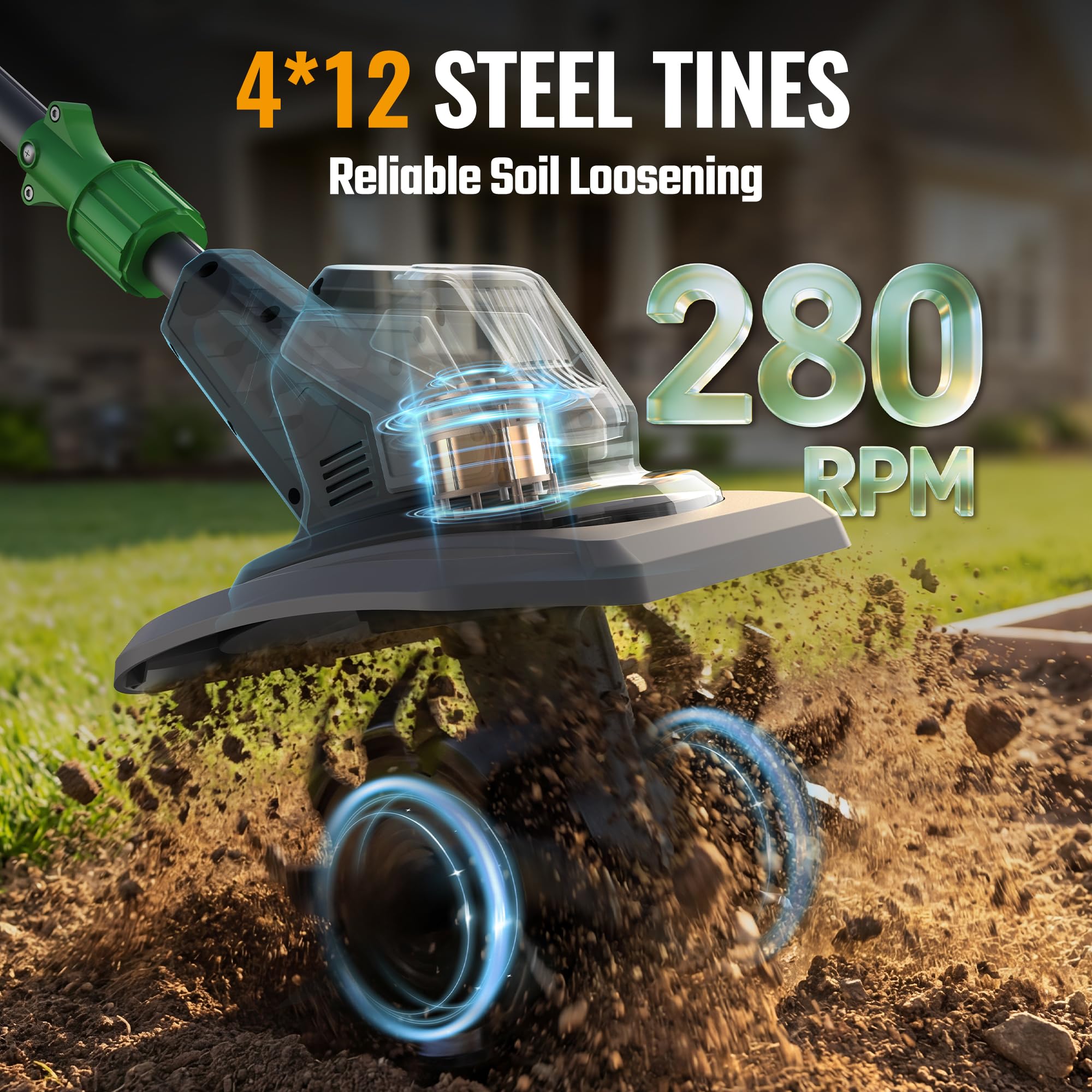 - Efficient Multi-Use Performance: Powered by a high-speed 280RPM motor, this cordless tiller delivers consistent performance to loosen, till, and weed with ease. Ideal for garden beds, vegetable plots, and lawns, it handles multiple tasks while breaking up compacted soil efficiently